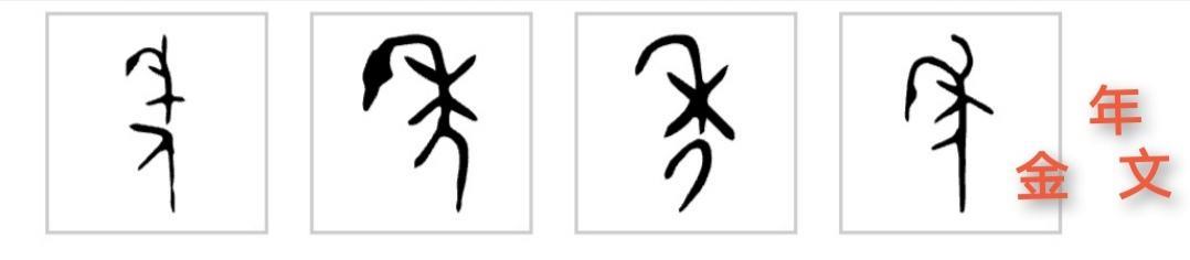 年字的甲骨文上面是代表庄稼的禾字,下面是一个人,表示一个人正在满载收获而归,本意是“收成”。甲骨卜辞中常见“受黍年”“受稻年”的文字。金文的年字基本维持了甲骨文的原型。