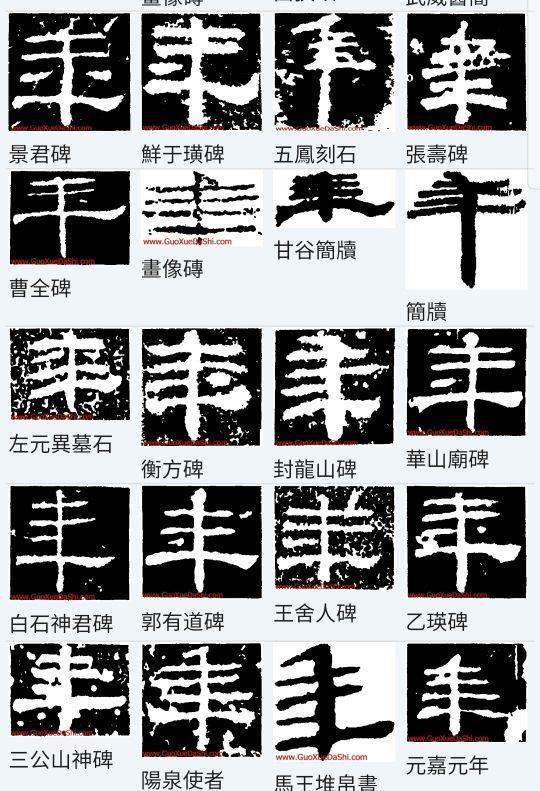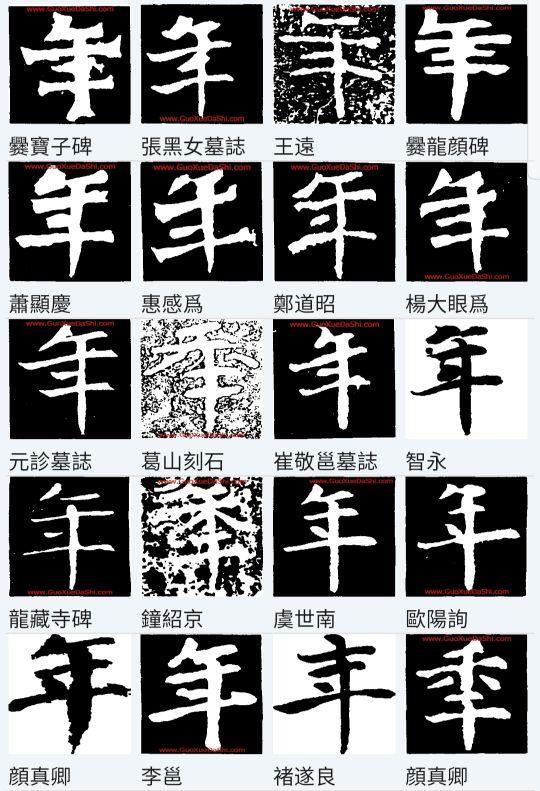 隶书的“年”字,继承了草书的特点,下面的“千”简化成“十”,并且中间的一竖和上面“禾”的一竖合成一笔,禾字的撇捺变成了横或点,上面的一撇有的也取消或变形了(下图)。