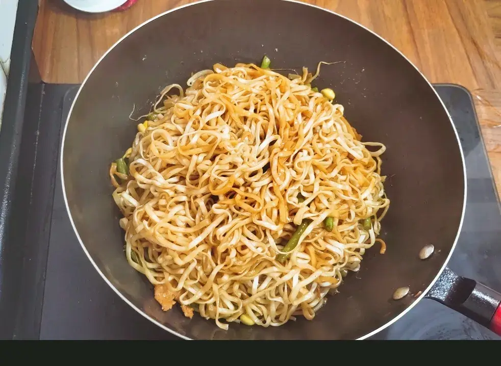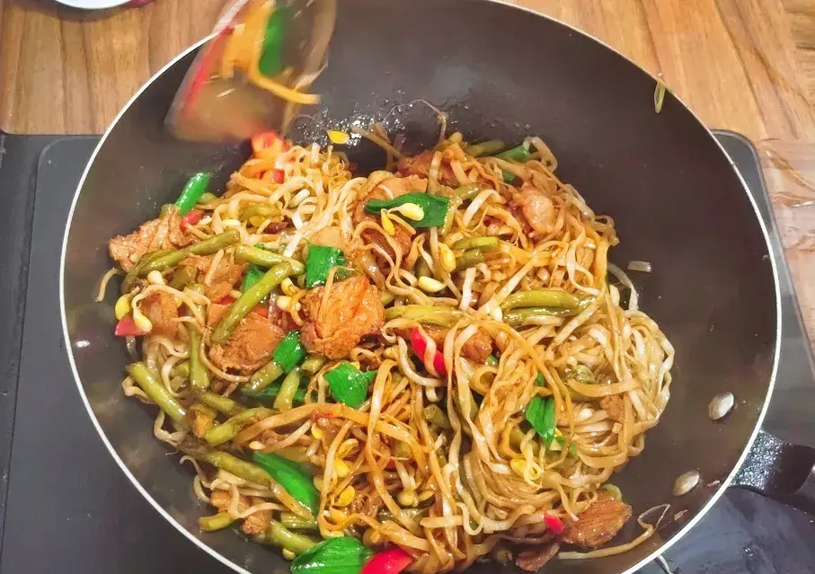 然后把面条翻面,这个过程要频繁观察锅中,防止干锅,我整个过程一般用中火进行蒸,料汤要分多次加入,通常情况十分钟面条就熟了,想要面条更加柔软筋道,就多蒸几分钟, 时间到了,再把面条和菜进行搅拌, 最后撒上葱花、青椒,翻拌均匀就可以吃了。