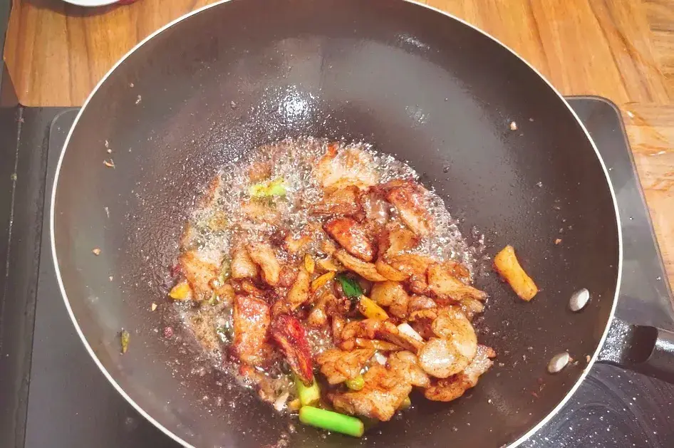 油热下入五花肉,火候为中火, 不停的把肉片进行翻炒,把五花肉的油脂炒出来