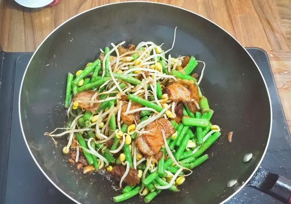 这时候火候开为大火,然后放入放入八角、花椒和葱姜蒜、小米辣,激发出香味,再倒入老抽继续翻炒,炒出酱香味,随后加入豆角、大豆芽, 加入盐、生抽、适量五香粉 、鸡精,翻拌均匀后,