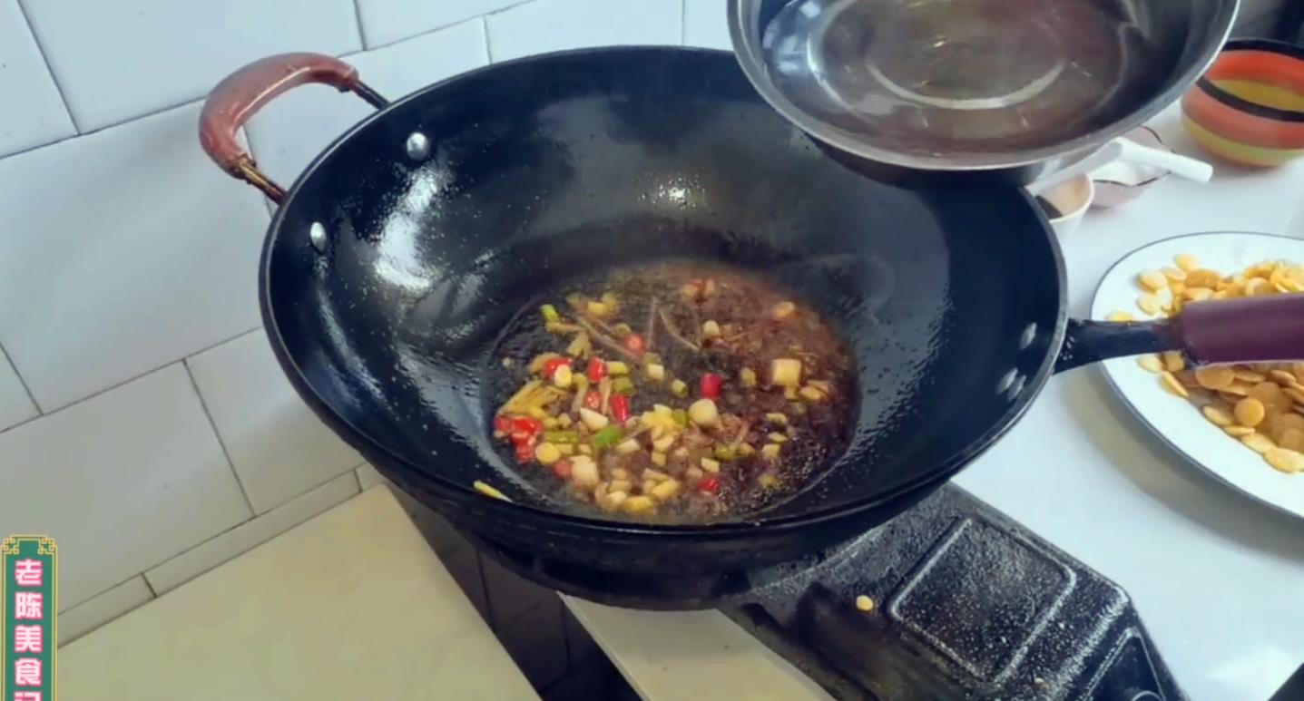 锅中留有底油,把切好的,葱花、蒜末、小米辣、姜丝下入锅中炒香,加入少许白糖来提味,生抽2勺、老抽几滴、加入一碗清水,加入适量的食盐和鸡粉,少许的胡椒粉,大火煮开。