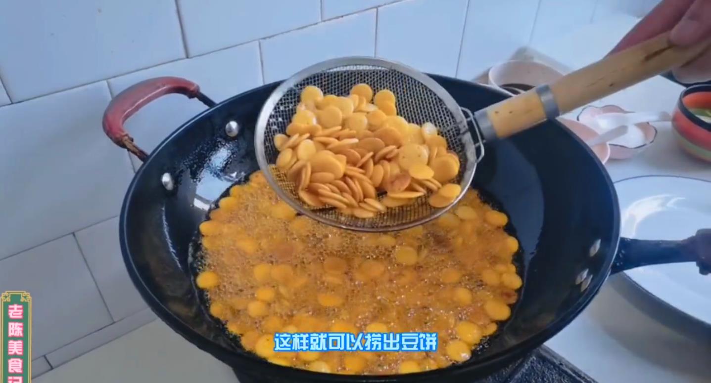 锅中加入适量的食油,把油烧至6成热,下入豆饼炸,大约炸至1分钟,炸至豆饼的表皮微微发硬,快速捞出。