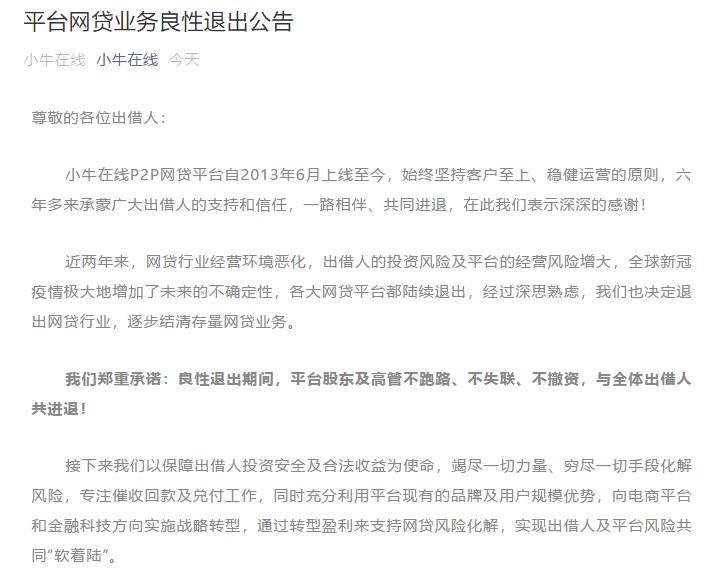 刚刚!小牛在线终于扛不住了!宣布退出网贷行业