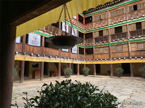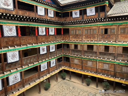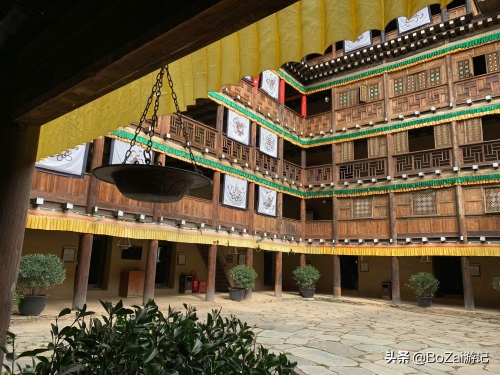 土司官寨也被称作土司署或是土司官邸。卓克基土司官寨的建造者,便是末代土司索观瀛。他所设计的官寨,是一座易守难攻的封闭式四合院。官寨中,除了结构特别外,还有两处值得一提:其一便是极有民族特色的内院天井;其二,便是官寨的墙体。