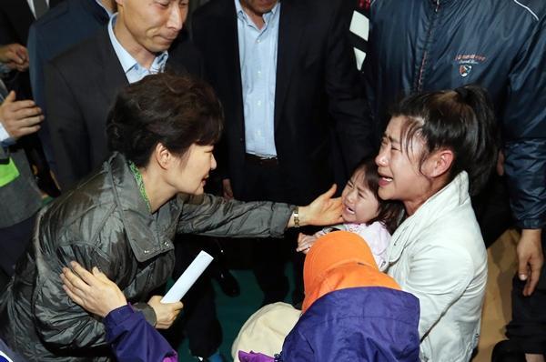 只留下亲切的朴槿惠怀着“沉痛”的心情搀扶和安慰一位遇难孩子母亲的画面。