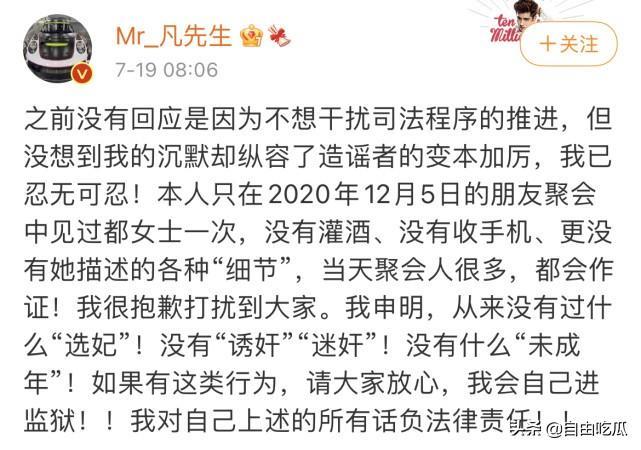 7月19日一早,吴亦凡对都美竹的“控诉”长文做了回应。不同于都美竹的千字长文,吴亦凡的声明极其简单,主要想表达的就是都美竹造谣。