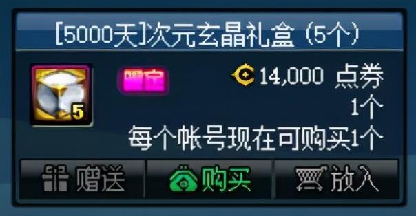 花费14000点券可以购买5个次元玄晶,若是与商城20000点券的原价相比,还是非常良心的,给出了七折的折扣,但实际上用点券直接购买次元玄晶的人少之又少,性价比较低。