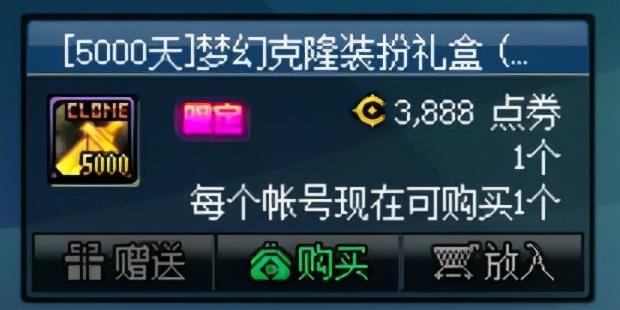 花费3888点券可以购买梦幻克隆装扮礼盒(武器),笔者建议有需求的玩家积极购买。