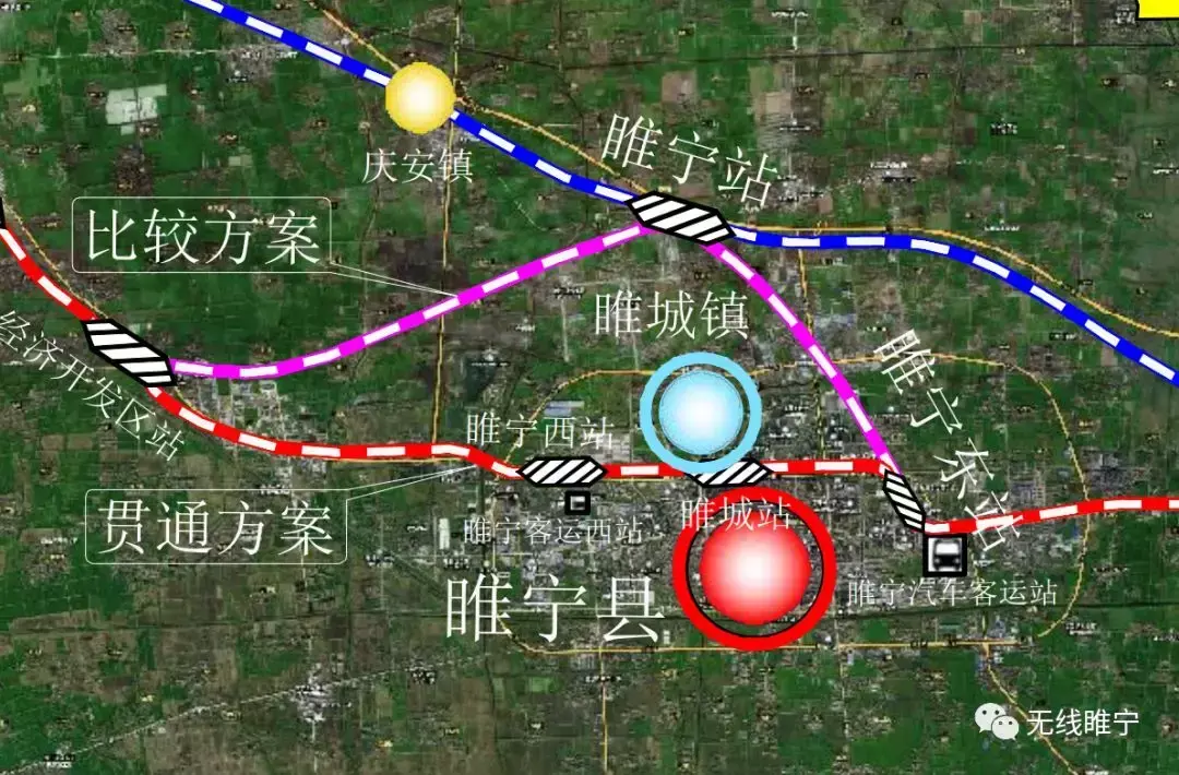 徐睢宿市域铁路睢宁段起自徐宿淮盐城际铁路观音站,线路沿G104国道走行,到经济开发区后,在睢宁县内分两个方案比选。