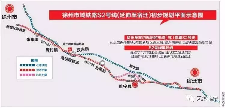 5月15日,睢宁县交通局召开“徐睢宿市域铁路睢宁段规划方案研讨会”。徐州将规划建设徐州新城区至睢宁徐宿淮盐城际铁路观音站(双沟镇)的市域(郊)铁路S2号线和睢宁徐宿淮盐城际铁路观音站至睢宁汽车客运站的S2号线延长线。