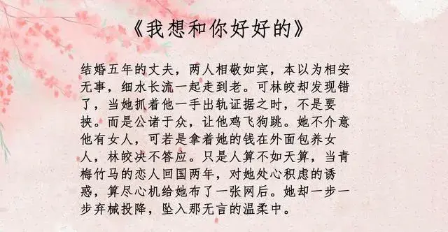 婚后,陆毅成在林家的帮助下,事业慢慢起飞,可同时两人婚姻也产生了危机。林皎和陆毅成虽然并无感情,但她却见不得陆毅成花着自己的钱在外面左拥右抱。两人间矛盾升级,而此时秦斯然的归国更为二人的离婚添了一把火。作者文笔很好,有很多老梗作者却写出了新的感觉,喜欢婚后文的小伙伴不要错过。