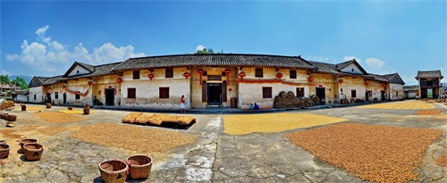 在贺州八步区莲塘镇,最出名的为江氏大宅,它还有一个响亮的名字——客家围屋。宋朝末年,江家的祖先来到莲塘镇,靠着为大户人家打工攒下的本钱,开荒造田,创建家业,种植水稻和甘蔗,做起了糖产生意,产品一度销往珠三角、香港等地。清朝灭亡之后,江家人便在莲花镇百花垌盖起了房子,即是如今的客家围屋。