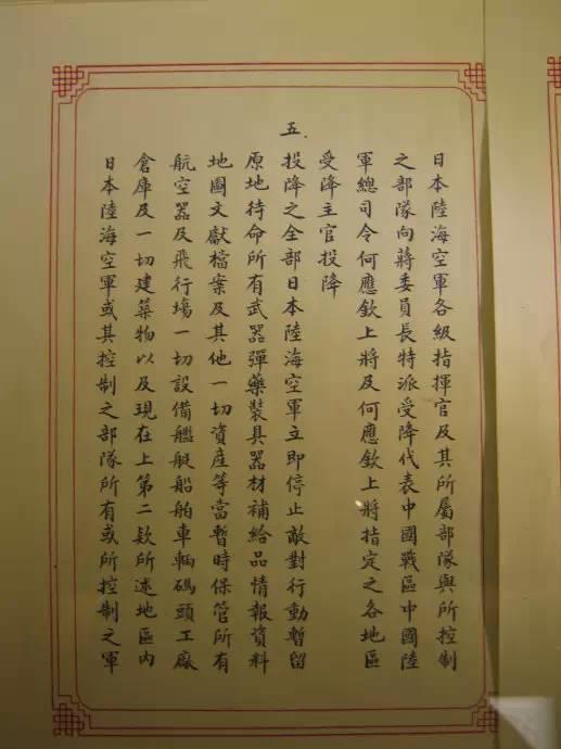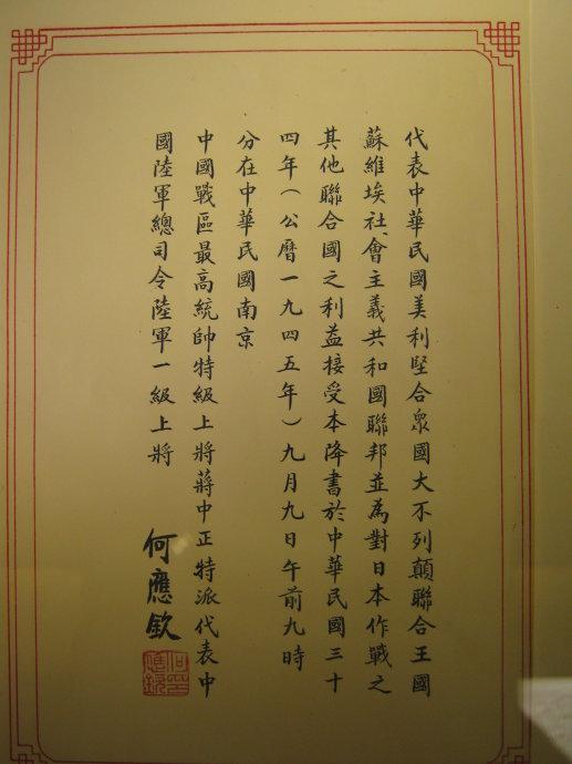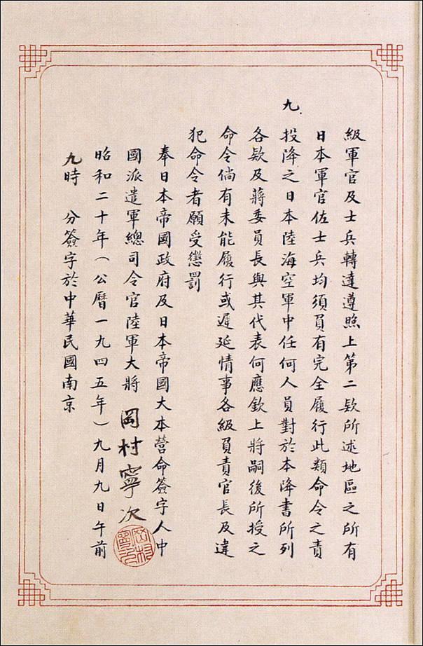 1945年9月9日,中国战区的日本投降仪式在南京举行。日本中国派遣军总司令官冈村宁次在对华投降书上签字,并向中方交出他的随身佩刀,以表示侵华日军正式向中国缴械投降。