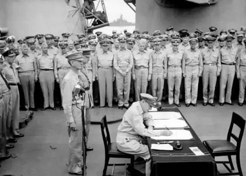 1945年9月2日,日本无条件投降签字仪式在停泊于日本东京湾的美国战列舰“密苏里”号上举行。9时4分,日本外相重光葵代表日本天皇和日本政府、参谋总长梅津美治郎代表日军大本营首先在投降书上签字。