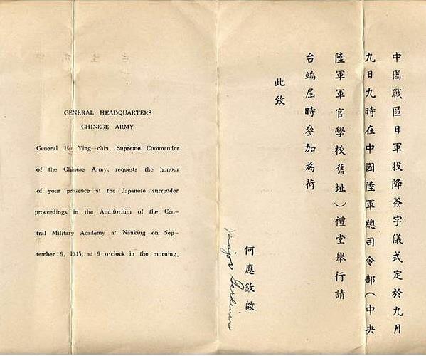 何应钦发的“侵华日军南京投降仪式”请柬