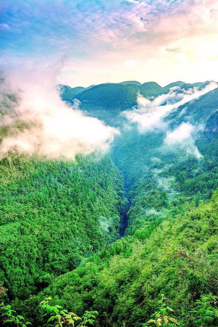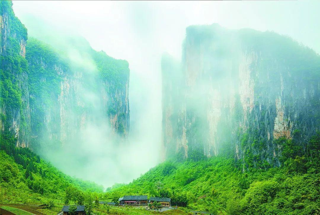 “天井峡”地缝是两座平行山峦间凹下去呈“V”字形的一条大裂缝,它发源于奉节县长安乡火烧二坝,由峡谷、消水洞和地下河构成,峡谷两边的山崖高达数百米,全长37公里,宽1-500米,深4-900米,分上、下两段。