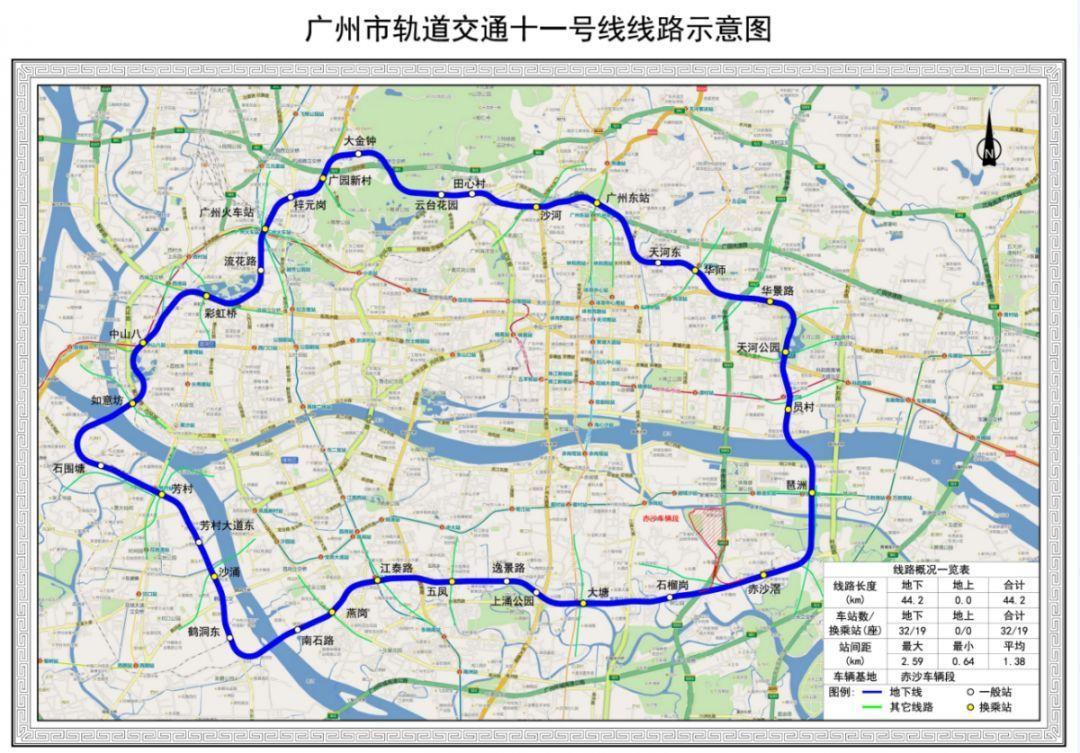 “大环线”11号线全长43.2千米,共设32座车站,线路穿过天河区、越秀区、荔湾区、白云区和海珠区五大中心城区。