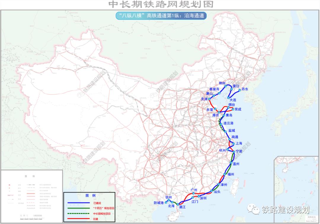 沿海通道大部分线路均已建成或在建,通道的关键区段津潍高铁、通苏嘉甬高铁也已于去年底正式开工建设。全线仅余合湛高铁未开工,目前可研报告尚未批复,如年内能开工则全线建成需要到2027年左右。