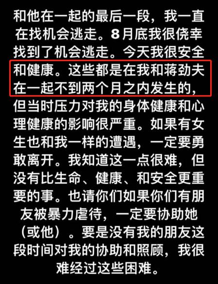 最后,她说自己8月份终于逃出来了,难以想象这是两个月内发生的事情,她决定将蒋劲夫的恶行告诉给大家。