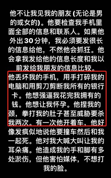 她写到,蒋劲夫砸她的电脑手机、甚至用剪刀剪断她的银行卡,想逼她怀孕。同时,蒋劲夫还对她实施身体上的暴力,又捏她的颈部,又拳打她的肚子,甚至多次说要杀了她。但蒋劲夫害怕被媒体拍到,所以对女生的四肢造成伤害却从不打她的脸。