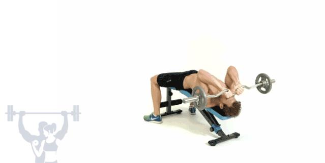 1.仰卧在平凳上,正手窄握杠铃(直杆和曲杆)置于头顶,和卧推一样,重心向下落在肩胛骨上;