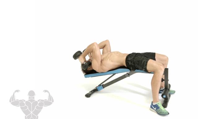 不要使用太大的重量,因为在将哑铃往下放的过程中,如果用的重量太大,你就不能保持正确的姿势。在这组动作即将结束的时候,伸直双臂可以最大程度地收紧肱三头肌上的肌肉。锁定肘关节后,可以略微放松,因为你的骨架会来支撑哑铃的重量。