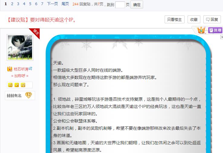 天谕的老玩家们也是对天谕IP下这款新作品相当期待,许多玩家自发在天谕手游的社交平台上打卡、签到,关注着手游目前的进度。甚至还有情怀党玩家列出32条叮嘱,把天谕的精髓都写进嘱托中,希望官方手游一定要对得起天谕这个IP,引来许多老玩家的支持。