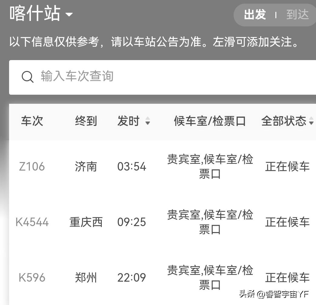 5喀什站。今天喀什有两趟离疆火车始发,其中:Z106次列车凌晨3点54分发出,目的地山东济南;K4544次早9点25分出发,目的地重庆。另有阿克陶始发的K4544次经停。