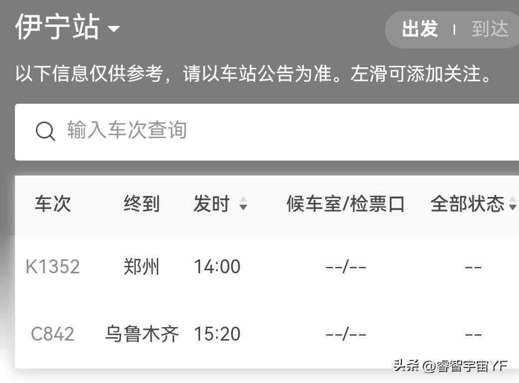 2伊宁站。今天中午14点整,K1352次将由伊宁站始发,经停奎屯等疆内站点,终到河南郑州。