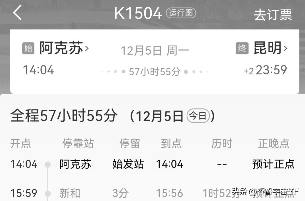 6阿克苏站。今天阿克苏有1列离疆火车,K1504次列车中午14点04分出发,经停新和等疆内站点,目的地云南昆明。