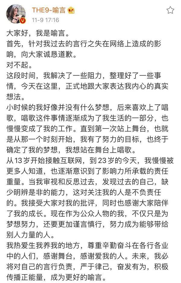 喻言在个人社交平台发文,她表示为过去言行之失造成的不良影响道歉。与此同时,喻言还称其在最近一段时间解决了很多阻力并且整理了一下自己的想法。23岁的她开始审视并反思过去,也发现了过去的自己缺少明辨是非的能力。接受大家的批评并且感谢陪伴,之后会谨言慎行,积极传播正能量。