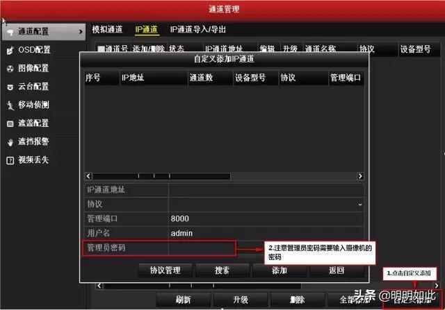 3. 通道管理-IP通道中再用自定义添加方式添加摄像机,添加时管理员密码为摄像机密码。