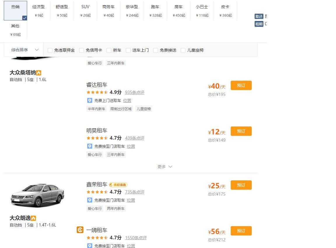 价格:这应该是携程租车平台最大的优势,各家同款车型价格一目了然,通常更有竞争力的价格会排在前面,当然有时候价格差异需要仔细甄别,笔者就遇到过便宜将近一半的车型是有限行区域的。