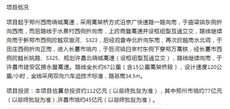 对于郑南高速郑州至许昌段,2021年6月份招投标结果出来了,项目全长67公里,估算总投资约112亿元,其中郑州市境约77亿元,许昌市境约45亿元。