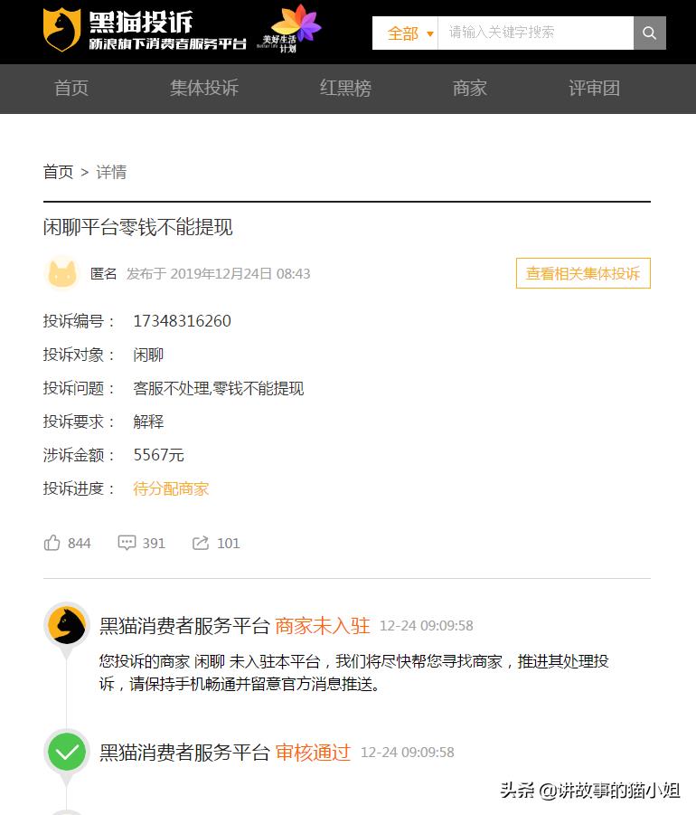 不过,黑猫消费者服务平台显示,被多名用户投诉的“闲聊”app并未入驻,服务平台对于这类投诉的回复为:我们将尽快帮您寻找商家,推进其处理投诉,请保持手机畅通并留意官方消息推送。
