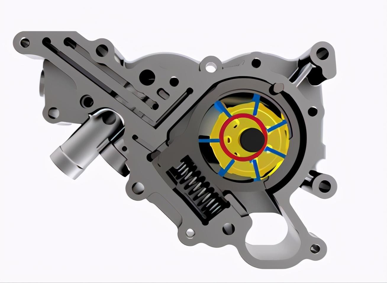 通过两级可变流量机油泵可实现机油流量,电磁阀控制机油泵的偏心距离,机油压力按需进行两级控制,可变机油泵解决了传统定量机油泵供油量过剩问题,工况油耗可以降低1.8%左右。