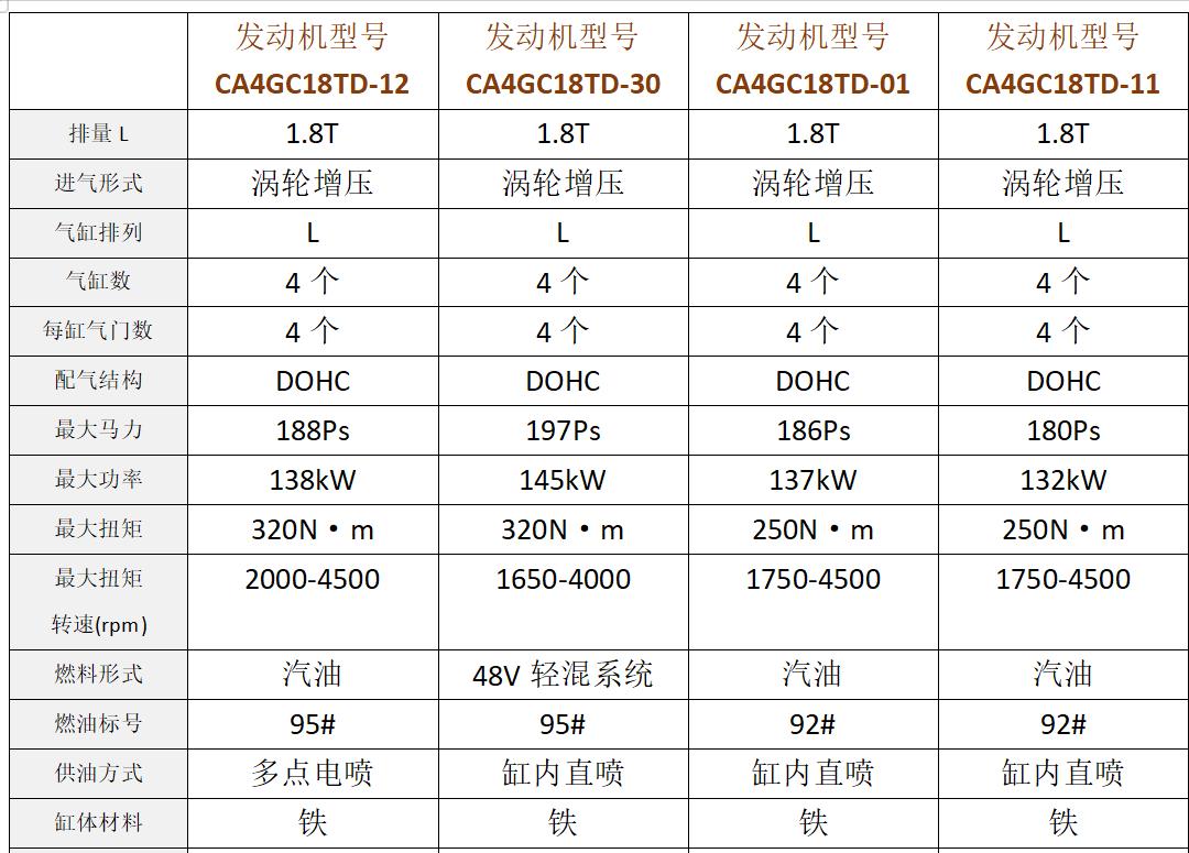 通过发动机参数来对比,以在售车为主,CA4GC18TD-12发动机技术较老,CA4GC18TD-30发动机是在H7上升级来的,燃料形式为48V轻混系统。