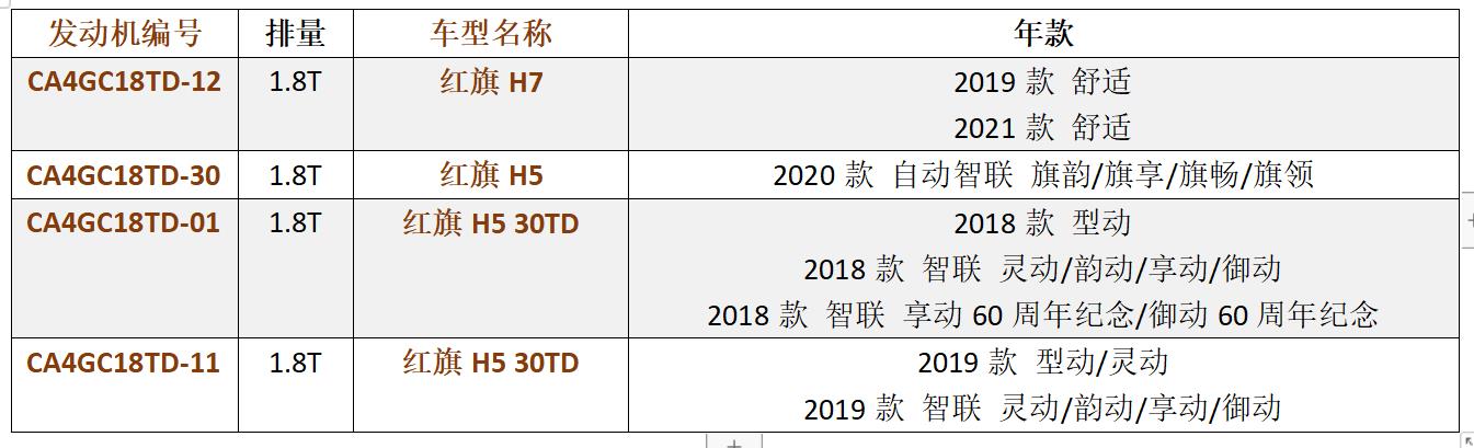 CA4GC18TD-12发动机是2019年上市,搭载的车型是红旗H7;CA4GC18TD-30发动机是2020年上市,搭载的车型是红旗H5;CA4GC18TD-01发动机是2018年上市,搭载的车型是红旗H5 30TD,目前已经停产;CA4GC18TD-11发动机是2019年上市,搭载的车型是红旗H5 30TD,目前也已经停产。