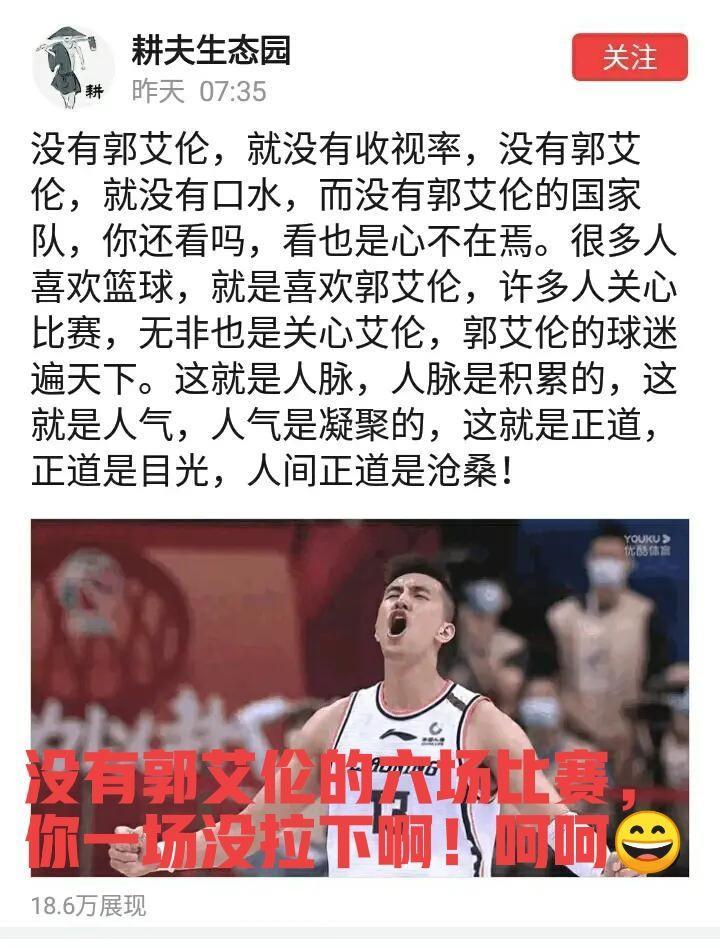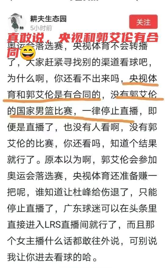 说什么“央视与郭艾伦有合同了!没有郭艾伦就不直播,就没人看球了”[捂脸][捂脸]……说的那些东西,但凡是正常人谁信?