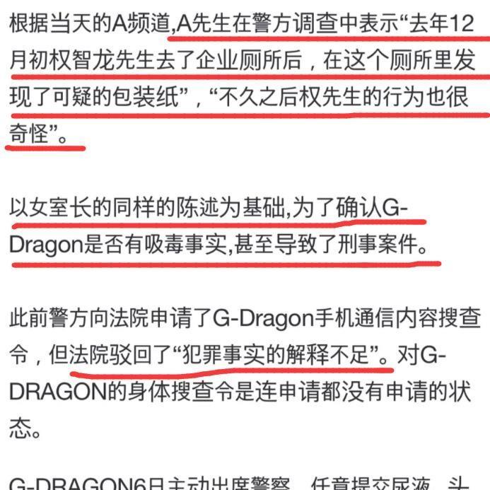 再说到证据问题上面来。现在警方手上唯一能拿得出手的就是一个娱乐场所女室长的口供。她说去年12月份在男厕所撞见过权志龙,并且看到了一些可疑的包装纸。然而啊,公共男厕所谁都能进去,法院觉得这样的证据力度不够啊!所以就驳回了对权志龙通信内容的搜查令。