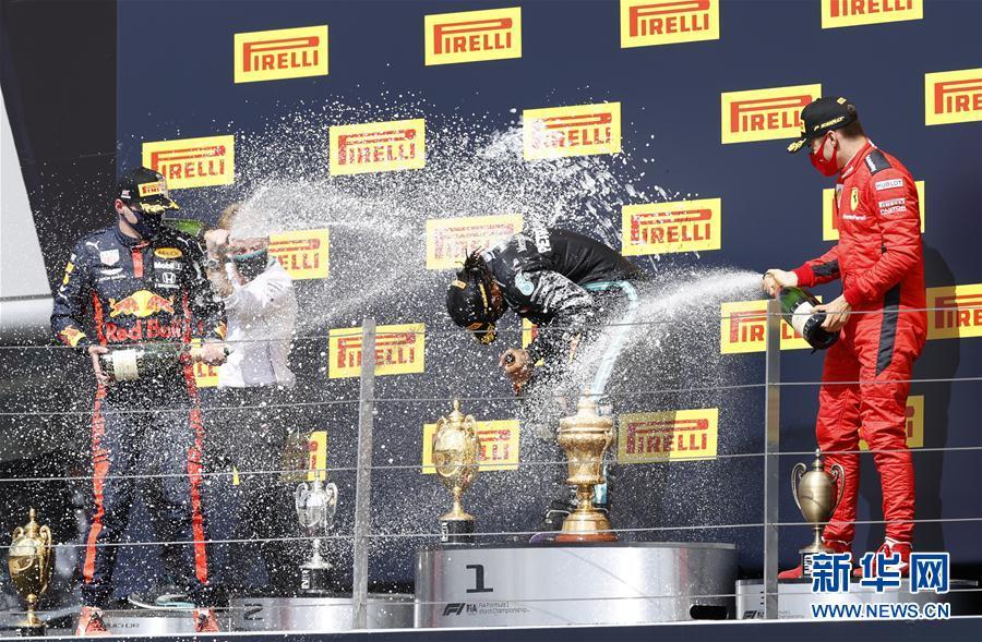 8月2日,冠军梅赛德斯车队英国车手汉密尔顿(中)、亚军红牛车队荷兰车手维斯塔潘(左)和季军法拉利车队摩纳哥车手勒克莱尔在颁奖仪式上喷洒香槟庆祝。 当日,在2020赛季世界一级方程式锦标赛(F1)英国大奖赛正赛中,梅赛德斯车队英国车手汉密尔顿以1小时28分零1秒283的成绩夺得冠军,红牛车队荷兰车手维斯塔潘获得亚军,法拉利车队摩纳哥车手勒克莱尔获得第三名。 新华社/路透