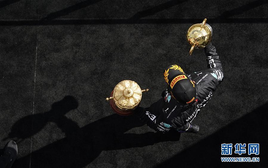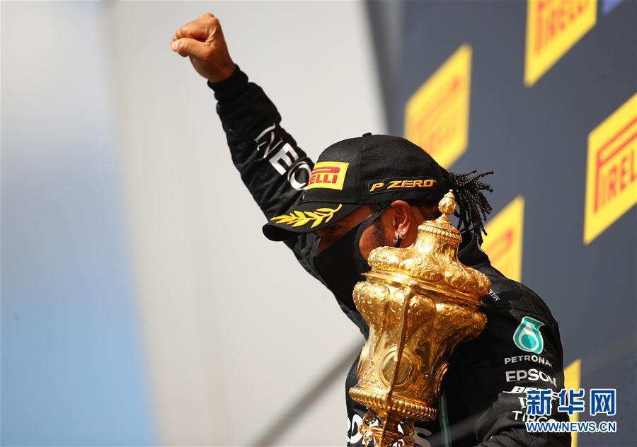 8月2日,梅赛德斯车队英国车手汉密尔顿在颁奖仪式上庆祝。 当日,在2020赛季世界一级方程式锦标赛(F1)英国大奖赛正赛中,梅赛德斯车队英国车手汉密尔顿以1小时28分零1秒283的成绩夺得冠军,红牛车队荷兰车手维斯塔潘获得亚军,法拉利车队摩纳哥车手勒克莱尔获得第三名。 新华社/路透