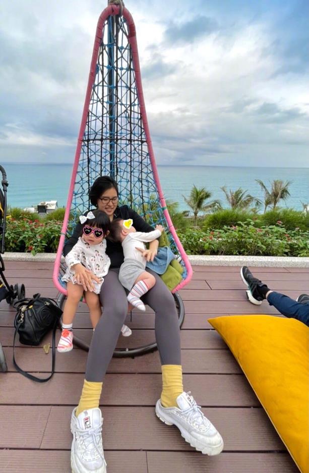 照片中,谢依霖坐在室外休闲椅上,一双大长腿格外吸睛,看来产后健身很有成效。怀中抱着两个孩子,大女儿穿着碎花裙,可爱乖巧。小儿子依偎在母亲身上,五官精致似精灵,视线看着远处大海,充满了好奇。谢依霖的老公则是躺在旁边的地垫上,伸出一条长腿出镜,一家四口极为幸福。