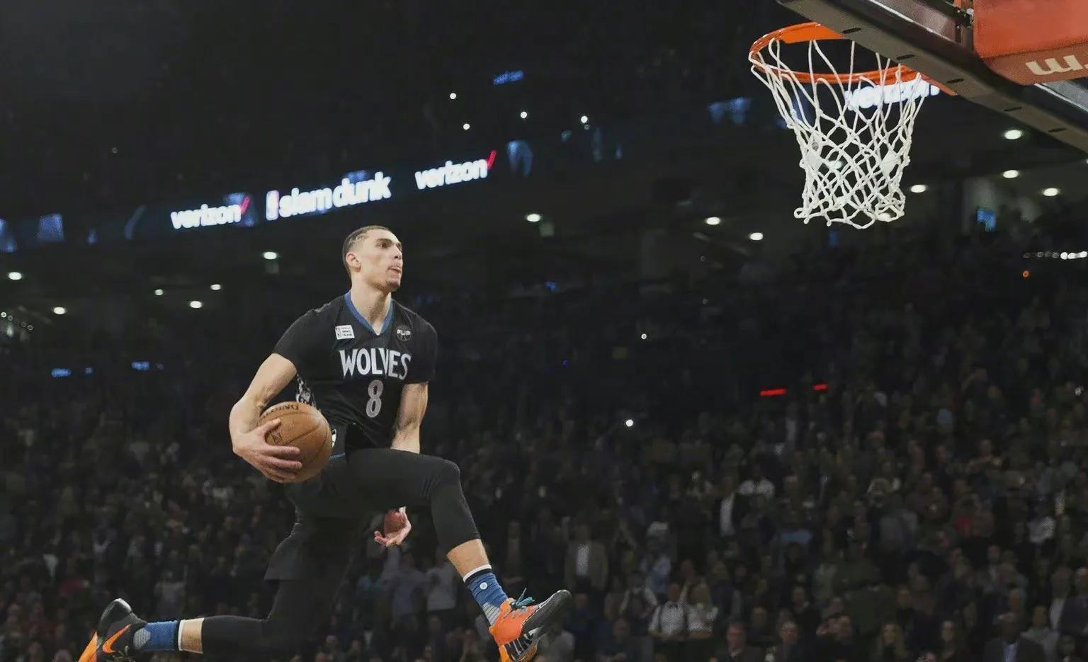 这是戈登第一次参加扣篮大赛,他面对的是卫冕冠军,来自森林狼的天才少年 扎克-拉文,拉文的扣篮风格飘逸,弹跳能力出类拔萃,能够在罚球线起飞做出各种令人瞠目结舌的动作,从各种回放角度看,仿佛在欣赏他在篮球场上各种动作的飞翔。