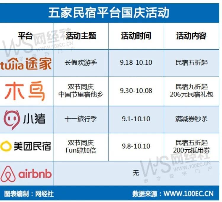 此外,针对国庆假期,途家、木鸟民宿、小猪民宿、美团民宿纷纷推出优惠活动,刺激用户消费。