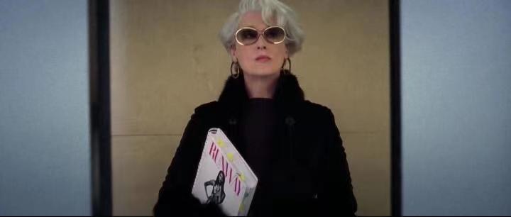 这个时候随着电梯到达开门,镜头才第一次从正面拍了米兰达,米兰达摘了墨镜,银色的短发配上她精致的面部五官,足足气场全开的职场女精英派头。在走向自己办公室的路上,她已经向艾米莉交代了好几件事情。