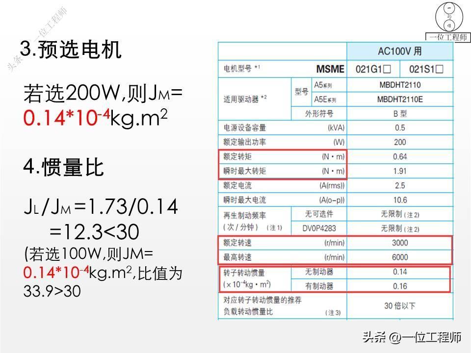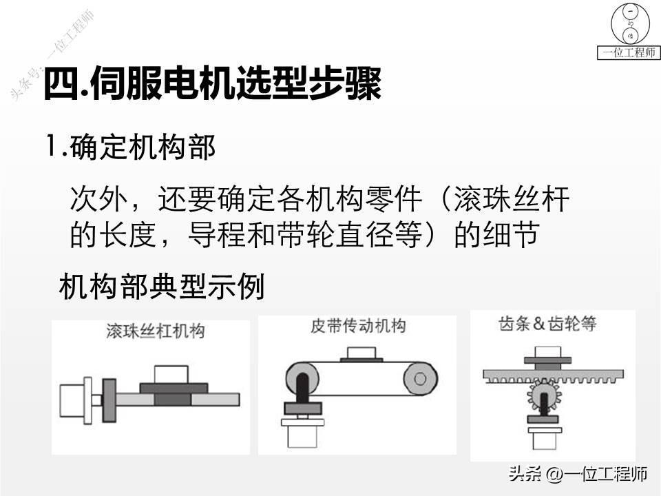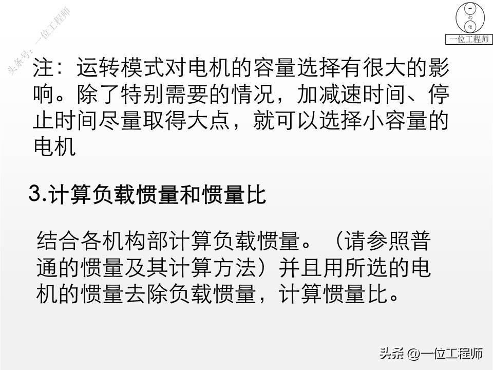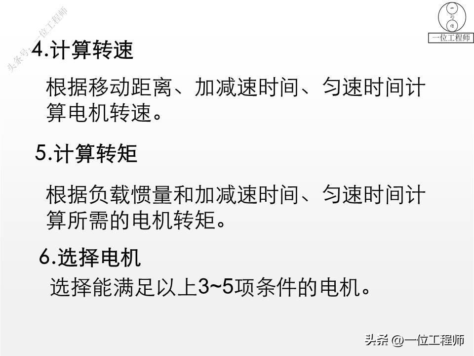 1.确定机构;2.确定运转模式;3.计算负载惯量和惯量比;4.计算转速;5.计算转矩;6.选择电机。