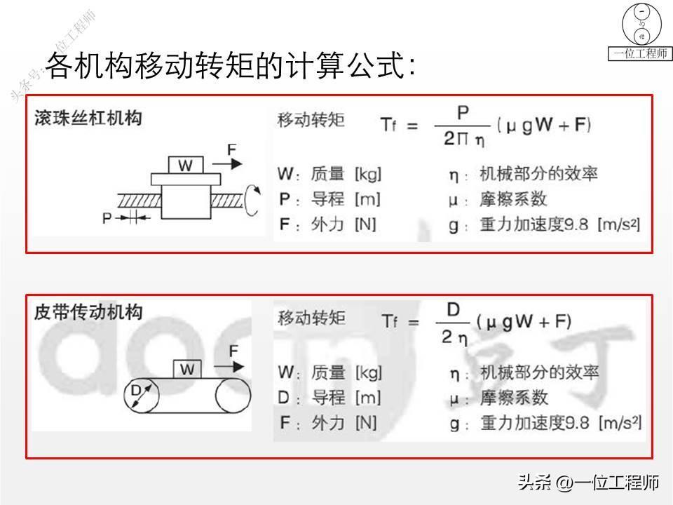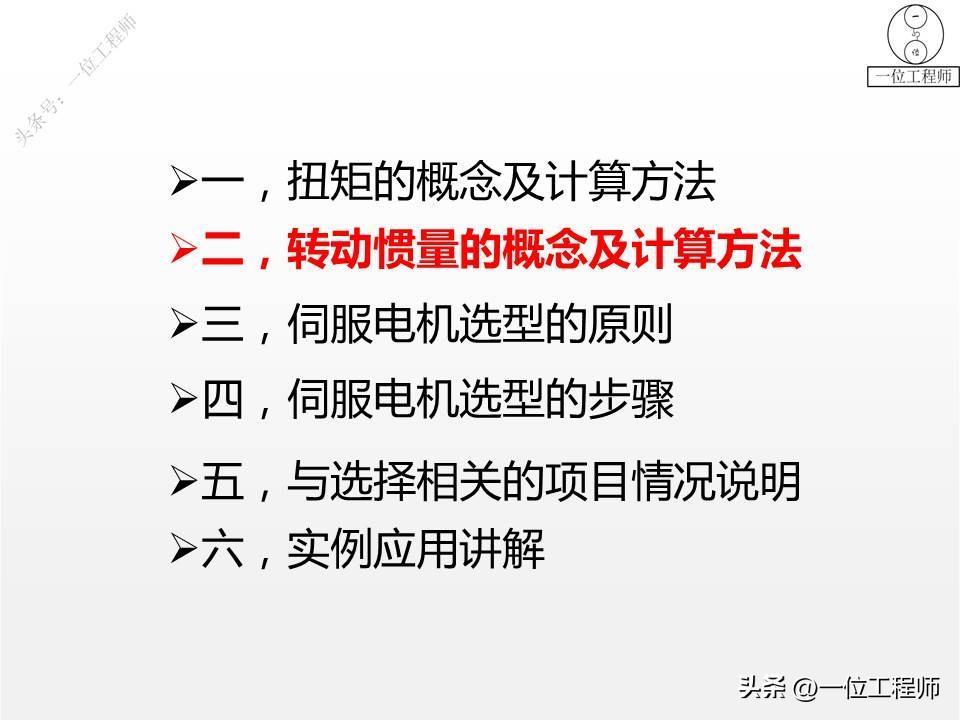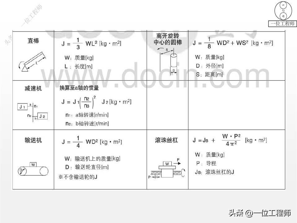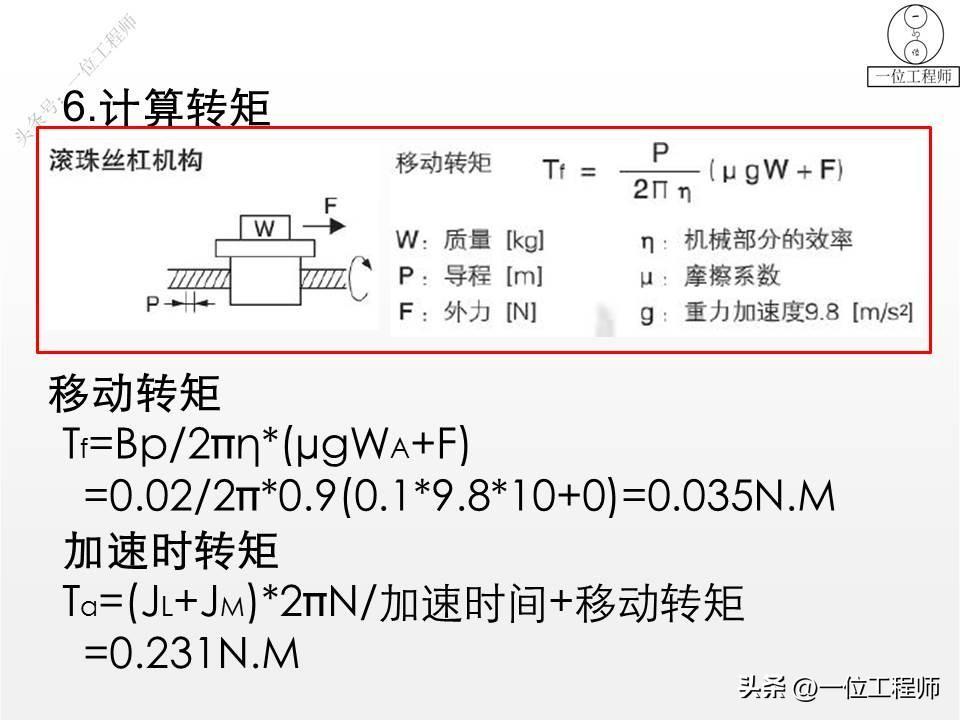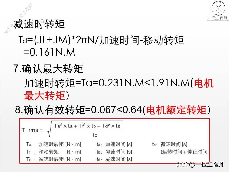 1.确定机构;2.确定运转模式;3.计算负载惯量和惯量比;4.计算转速;5.计算转矩;6.选择电机。