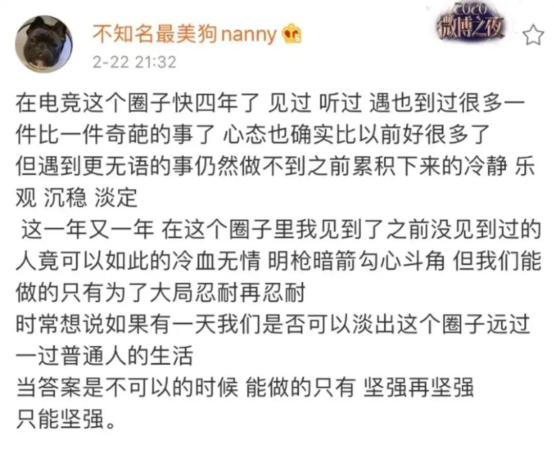 当年,Uzi的经济合同被RNG偷偷转到小象大鹅,Uzi跟风哥一起吃饭时,说听到这个消息后,Uzi本人都是出于一脸懵的状态。之后,Uzi老婆奥咪咪也发文,怒斥RNG管理层,说在圈子里从来没有遇到过这么冷血无情、勾心斗角、明枪暗箭的人,但为了大局只能忍耐。我记得,当时也是引起了一番热议。